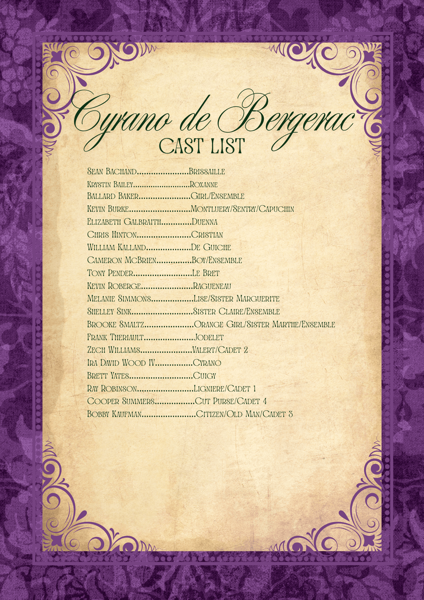Please see below for the cast list of Theatre In The Park's upcoming production of Cyrano de Bergerac . Thank you ALL for coming out! The talent we saw was EXCEPTIONAL, making the casting process very difficult. If you did not make the list this time, PLEASE keep auditioning!
